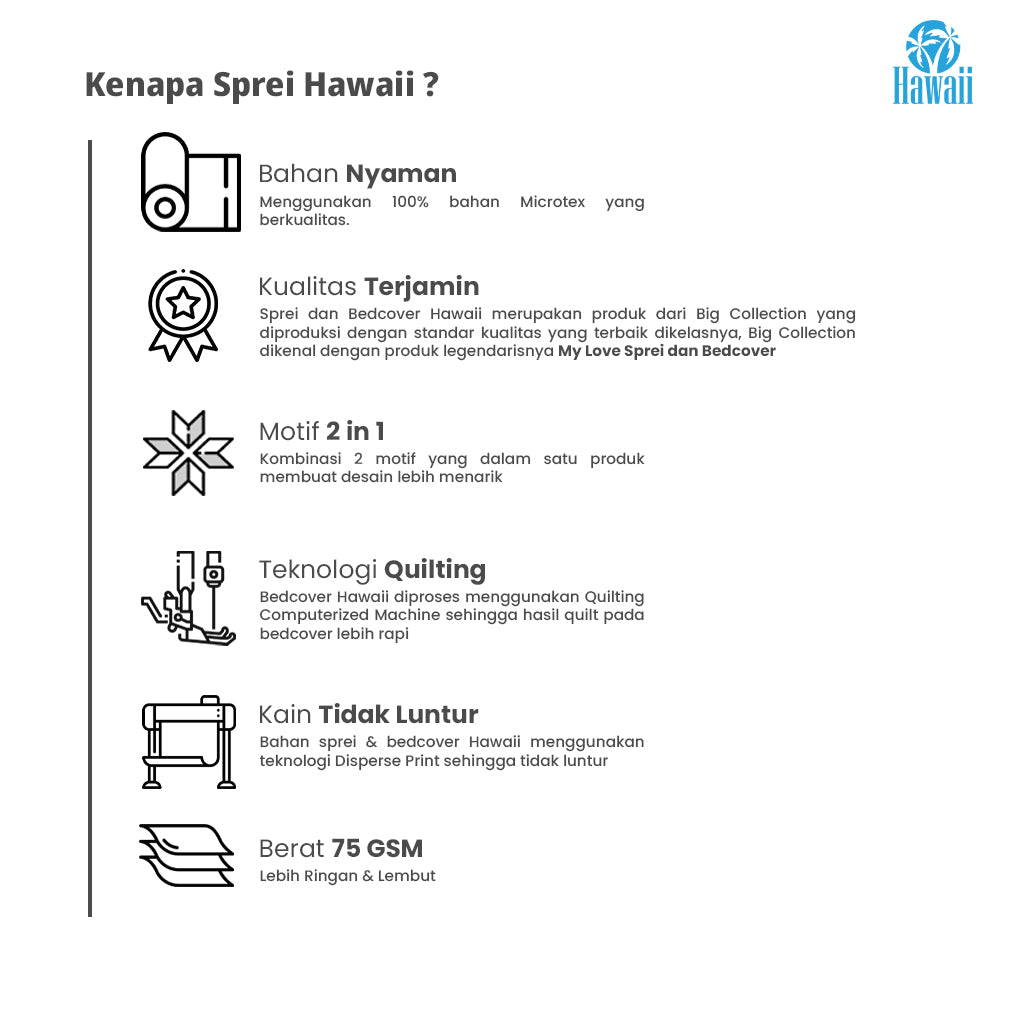 Sprei & Bedcover Hawaii Ringan, menggunakan bahan Microtex dan Teknologi Disperse Printing sehingga lembut dan tidak luntur