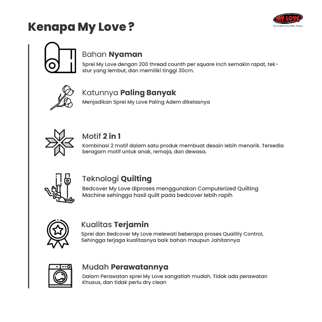 Sprei dan Bedcover My Love merupakan produk dari Big Collection yang diproduksi dengan standar kualitas yang terbaik dikelasnya.